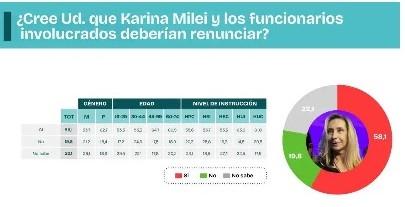 En relación con la posible renuncia de Karina Milei y otros funcionarios involucrados en la supuesta coima en la ANDIS, un 58,1% opinó que deberían renunciar, mientras que un 19,8% dijo que no. Un 22,1% manifestó dudas sobre la decisión.