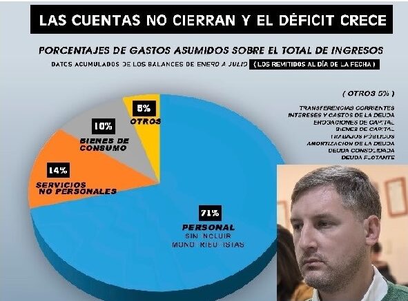 El concejal opositor explicó que, además de Termas, la coparticipación nacional (30%) y la coparticipación provincial (13%) constituyen las principales fuentes de ingreso del municipio. Sin embargo, los balances muestran que el gasto de funcionamiento —personal, bienes de consumo y servicios no personales— absorbió más del 95% de los ingresos entre enero y julio.